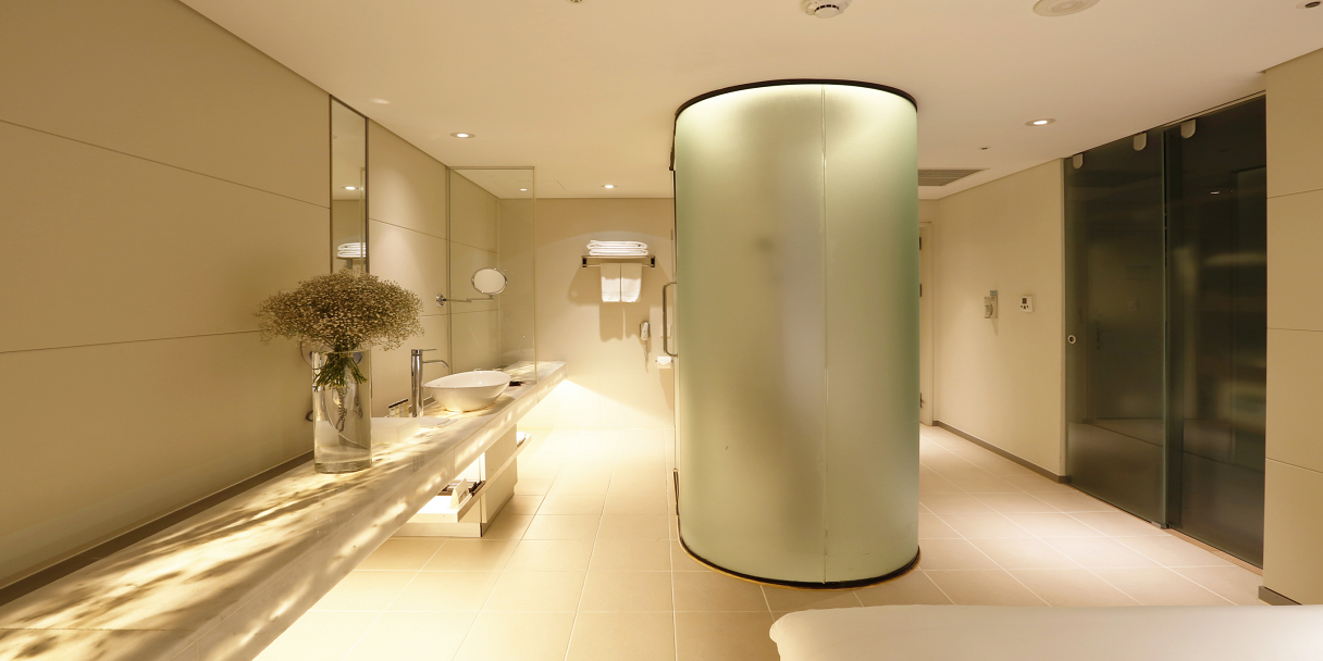 The design concept of Modern Room is a sophisticated expression of sleek urban looks. Please notice the stylish shower booth made of cylindrical glass, emphasizing spatial expansion and flexibility through transparency and openness. The guestroom walls are fitted with marble shelves with soft lighting installed beneath them, adding to the room’s comfortable ambiance.