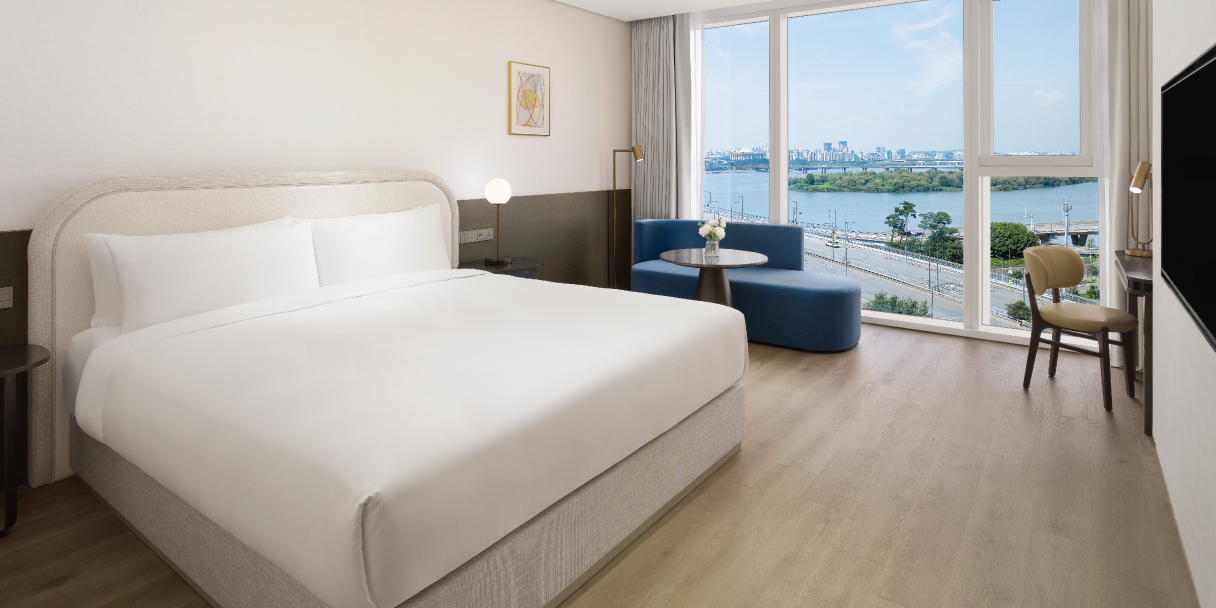 디럭스 리버 객실은 호텔의 정수를 보여주는 곳입니다. 전면 유리창을 통해 바라다보는 한강은 물론, 역동적인 동시에 고요함을 선사하는 서울의 모습을 바라보는 순간은 여러분의 일상에 회복의 힘을 더해드립니다. 킹사이즈 침대와 둥근 형태의 욕조 및 분리된 샤워 공간이 있는 대리석 욕실, 55인치 4K UHD 스마트 TV 등을 갖추고 있습니다.