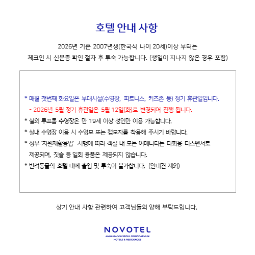 노보텔 앰배서더 서울 동대문은 글로벌 호텔 그룹 아코르(Accor)가 선보이는 500번째 노보텔로, 쾌적한 시설과 세심한 서비스로 차별화된 숙박 경험을 제공합니다.
