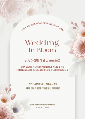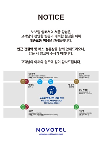 1993년 9월 개관한 호텔 노보텔 앰배서더 서울 강남은 프랑스풍 5성 특급 호텔로 전세계 400여 개의 노보텔 체인 중 하나로 세계적인 브랜드에 걸맞은 고품격 서비스와 시설을 자랑합니다. 7개의 스위트 룸과 57개의 이그제큐티브 룸 등 총 332개의 안락한 객실을 갖추고 있으며 강남 코엑스, 무역센터, 경부 고속도로와 인접해 있고 인천 국제공항과 김포공항 이용에도 용이한 위치에 있으며 공항과 호텔 간 KAL 리무진 버스가 약 1시간 마다 호텔 정문에서 출발합니다.